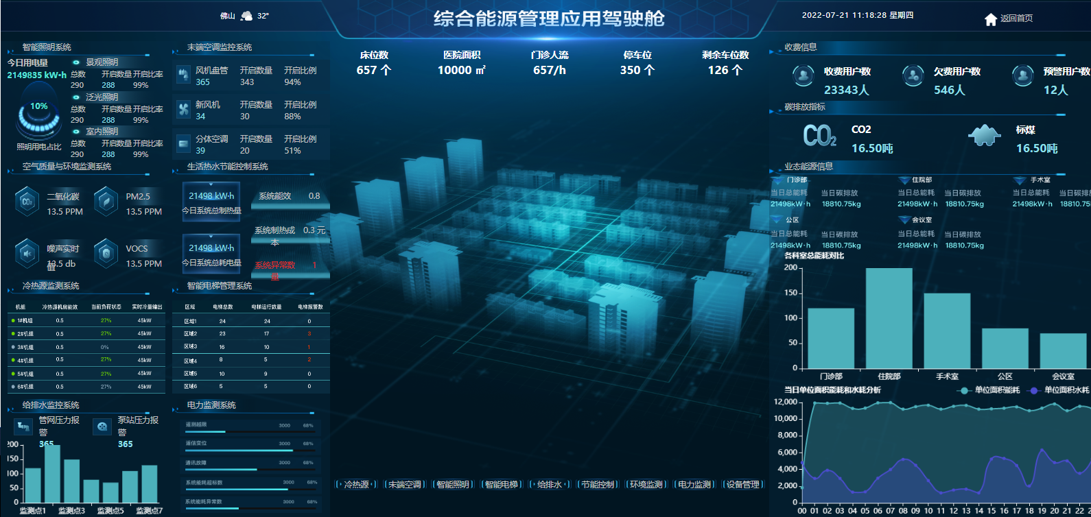 平台实时监控采集各院区中央空调系统耗电量、各楼宇用水用电量,通过远程控制、定时定量、数据分析、运维管理、决策辅助等功能辅助医院及时采取节能措施,降低空调能耗、减少人为能源浪费、提升医院能源智能化管理水平。