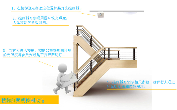 公共区域在现有基础的照明灯具基础上,通过加装光感+人体红外感应模块控制器,实现公共区域照明系统的智能控制。